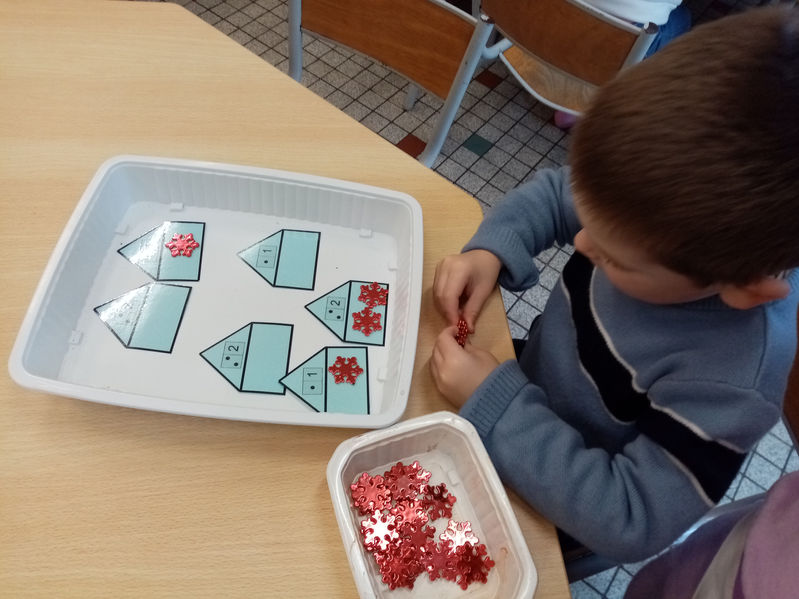 Dans cet atelier de numération, nous devions mettre un objet dans les maisons du 1 et deux objets dans les maisons du 2.