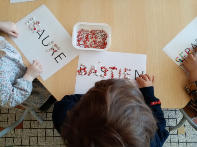 Afin de travailler la reconnaissance de son prénom et l'écriture de ses lettres, nous avons suivi le tracé des lettres avec des petits objets.