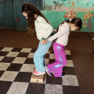 Pour développer des relations coopératives et bienveillantes entre les élèves, nous avons réalisé un jeu d'empathie dans lequel il s'agit tout d'abord de se déplacer à deux en étant dos à dos et ayant inséré entre les dos un ballon que l'on ne doit pas laisser échapper. Puis le jeu se complexifie avec des groupes d'élèves plus importants qui doivent alors trouver des solutions pour se déplacer ensemble avec le ballon sans le toucher avec les mains.